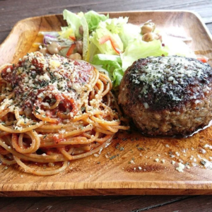 ジューシーなハンバーグがメインのランチプレート。ボリュームたっぷりで満足感のある一皿です。